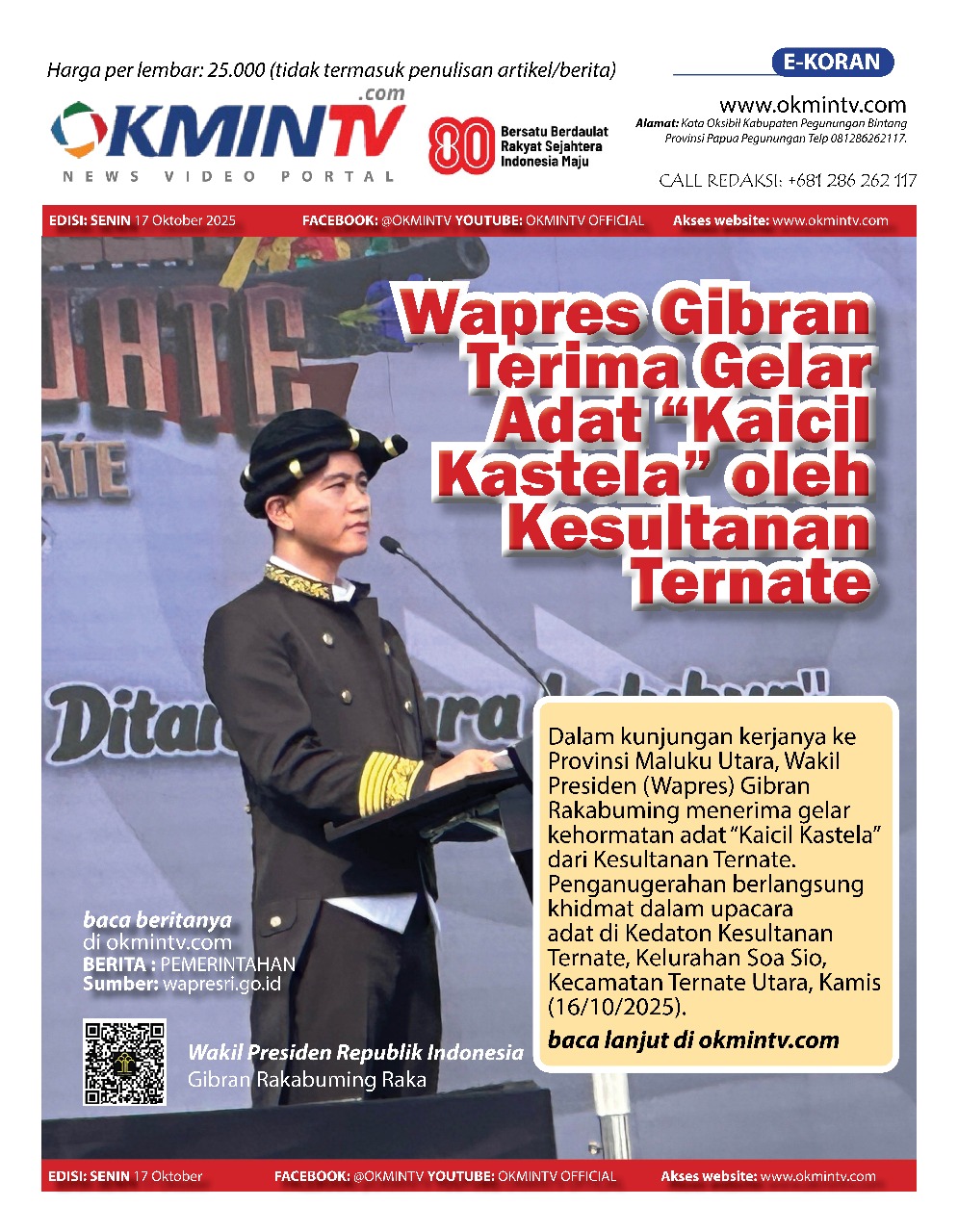 OKMIN TV – Dalam kunjungan kerjanya ke Provinsi Maluku Utara, Wakil Presiden (Wapres) Gibran Rakabuming menerima gelar kehormatan adat “Kaicil Kastela” dari Kesultanan Ternate. Penganugerahan berlangsung khidmat dalam upacara adat di Kedaton Kesultanan Ternate, Kelurahan Soa Sio, Kecamatan Ternate Utara, Kamis (16/10/2025).