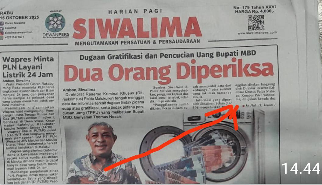 JAKARTA, – OKMINTV.com – Pemberitaan media cetak Harian Pagi Siwalima Maluku edisi 15 Oktober 2025 menarik perhatian yang sangat serius rakyat di Kabupaten Maluku Barat Daya atas berita yang diturunkan berjudul “Dugaan Gratifikasi dan Pencician Uang Bupati MBD” Dua Orang DIperiksa. Berita ini kemudian viral dan menjadi perbincangan dunia maya kepada orang nomor satu di daerah Batas Negara Indonesia Timor Leste itu.