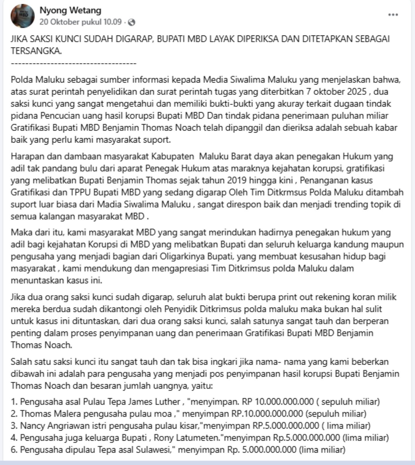 “Saya perlu menjelaskan bagi seluruh masyarakat Maluku Barat Daya bahwa, pemberitaan Media Siwalima ini benar, menjadi topik utama pemberitaan (HEADLINE) media ini dan dibenarkan langsung oleh Dirreskrimsus Polda Maluku Kombes Piter Yanottama, maka berita ini tak diragukan kebenarannya”, kata Akun Nyong Wetang dalam potingannya itu.