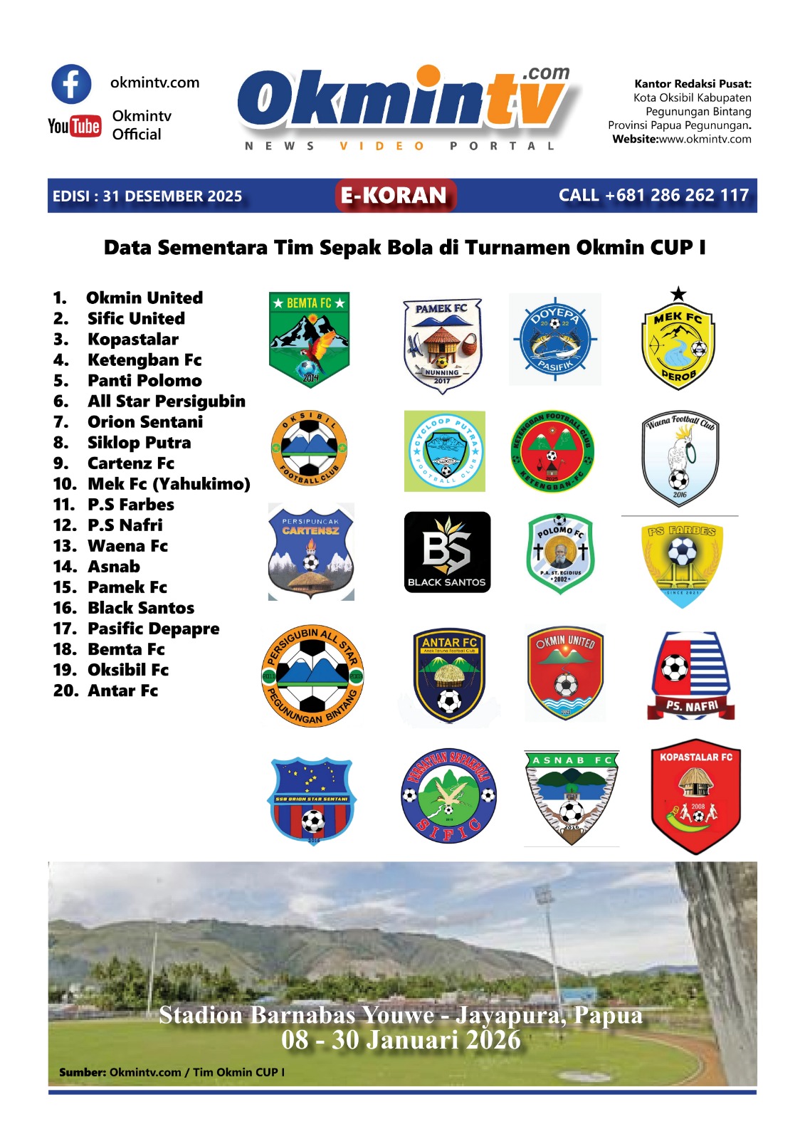 OKMINTV.com – Sahabat Okmin TV, ini adalah kabar terbaru untuk anda yang kami dapatkan melalui Tim Okmin CUP I tentang data atau jumlah tim Sepakbola yang saat ini telah resmi terdaftar untuk ikut dalam ajang pertandingan sepakbola Okmin Cup I yang akan berlangsung mulai 8 Januari 2026 mendatang.